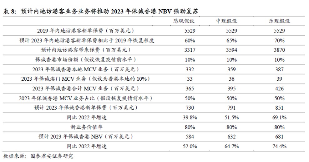 According to calculations by Guotai Junan, with the accelerated growth of mainland visitors to Hong Kong after customs clearance, and based on the assumption of a slight increase in the discount rate due to the rise in US dollar interest rates in 2022, it is expected that under the assumption of no major adjustments to the product structure, the new business value rate will rebound to 80% in 2023. It is estimated that under the improvement of both new policies and value rates, the year-on-year growth rate of Prudential Hong Kong's new business value will be 64.7%, and it will drive the year-on-year growth rate of the group's new business value to be 15.0%.