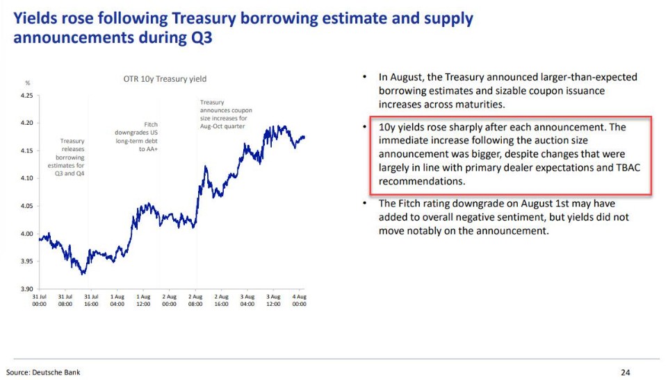 上週,美國四季度發債計劃塵埃落定,美國財政部公佈在 10 月到 12 月的今年第四季度,預計聯邦政府借款規模為 7760 億美元,較 7 月末預期的 8520 美元下調 760 美元。供應衝擊減少疊加美聯儲再次暫停加息,不少分析樂觀認為美債拐點已現。