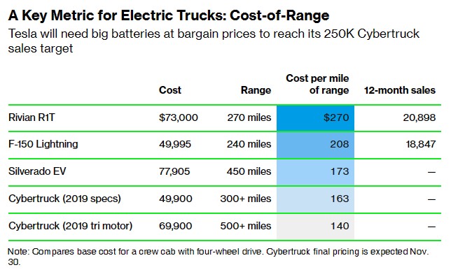 比較皮卡的一個很好的指標是每英里行駛里程的車輛成本。像 Rivian R1T 這樣的豪華探險卡車每英里行駛里程的成本可能更高,但特斯拉對 Cybertruck 的雄心明顯更大。特斯拉表示,它將有能力每年生產 25 萬輛 Cybertruck,這是 Rivian R1T 和福特 F-150 Lightning 早期年銷量的十倍以上。特斯拉想要賣出這麼多的 Cybertruck,每英里行駛里程的車輛成本就必須達到一流水平,才能吸引皮卡市場的廣大用户。