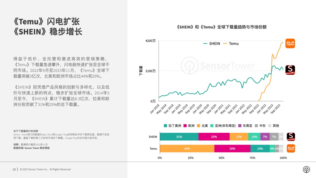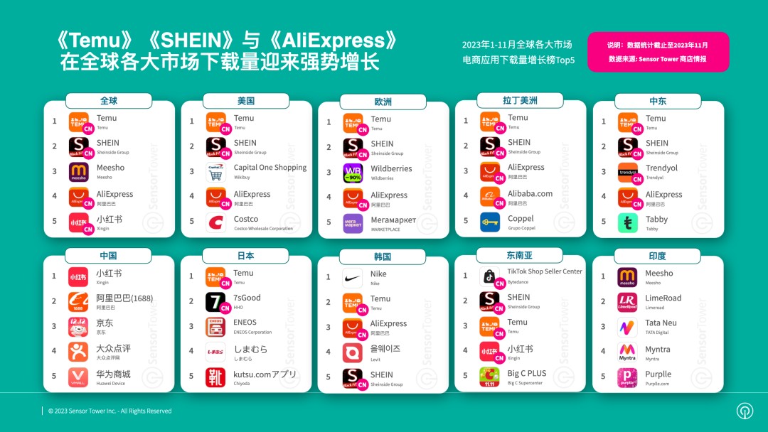 SensorTower: "Temu" and "SHEIN" top the global e-commerce app download and growth charts.
