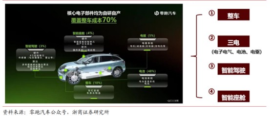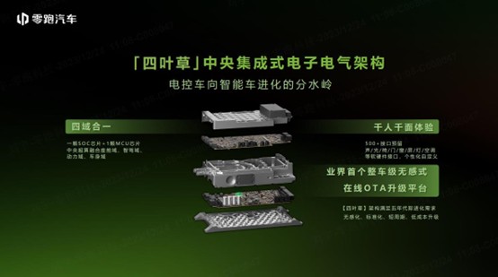 根據浙商證券的研報,零跑已實現智能電動汽車所有核心繫統和電子部件的自主研發設計與生產製造,自研自產覆蓋整車成本 70%,平台架構五年實現三次迭代。該公司的四葉草中央集成式電子電氣架構,實現 1 顆 SOC 芯片 +1 顆 MCU 芯片打造中央超算,做到了硬件和軟件的深度集成,實現軟硬件解耦,及軟件分層解耦分層迭代。在集成度方面,高於小鵬的 X-EEA 電子電氣架構,實現更優的智能駕駛體驗。