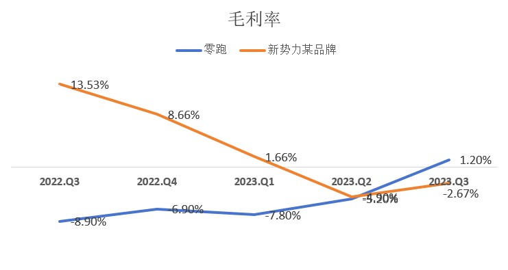 智通財經 APP 瞭解到,2023 年零跑持續提速提效,盈利能力季度保持提升趨勢。實際上,今年價格戰激烈,各大車企尤其是新勢力品牌,為獲得市場份額,大幅降價或者優惠權益,通過犧牲利潤獲取成長,價格戰對盈利的影響顯著,以銷量同一梯隊的新勢力某品牌為例,去年 Q3 毛利率為 13.53%,今年 Q2 及則持續虧損。