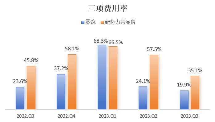 值得一提的是,零跑的各項費用也處於優化的趨勢,2023 年 Q3 三項費用率 (銷售、行政及研發) 為 19.9%,同比下降 3.7 個百分點,且相比於今年 Q1 及 Q2 分別下降 48.4 個及 4.2 個百分點。Q1 各大車企銷量均比較慘淡,導致費用率都較高,但之後均有所下降,相比較而言,零跑控費能力更強,Q3 及首三季三項費用率較新勢力某品牌分別低 15.2 個及 21.16 個百分點。