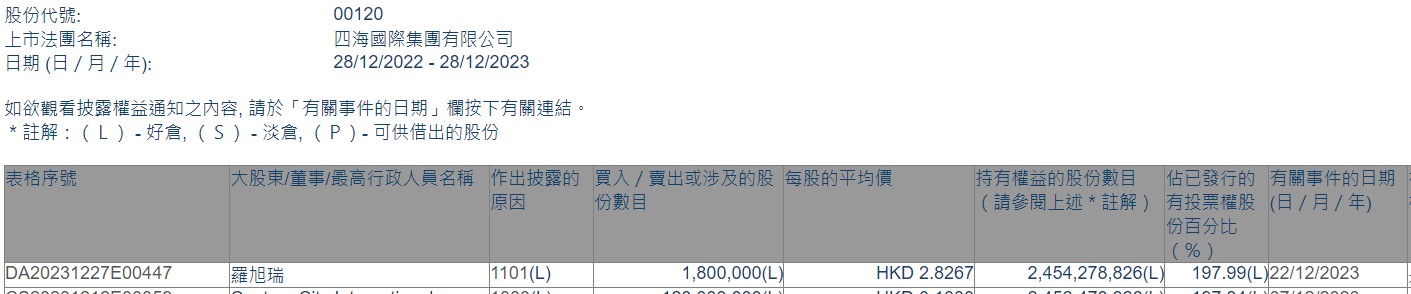 Zhitong App has learned that according to the latest information from the Hong Kong Stock Exchange, on December 22nd, Chairman and Executive Director Luo Xurui increased his holdings of Four Seas International (00120) by 1.8 million shares, with a price of HKD 2.8267 per share, for a total amount of approximately HKD 5.0881 million. After the increase, the latest number of shares held is approximately 2.454 billion shares.