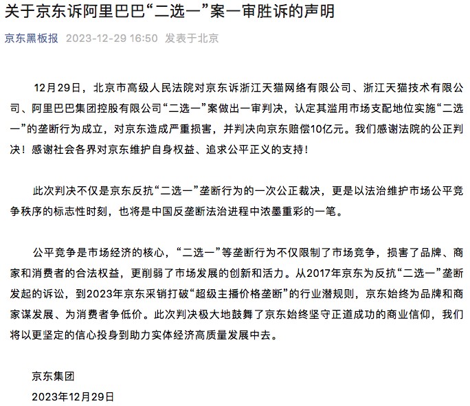 智通財經 APP 獲悉,12 月 29 日,據京東黑板報微信公眾號消息,北京市高級人民法院對京東訴浙江天貓網絡有限公司、浙江天貓技術有限公司、阿里巴巴集團控股有限公司 “二選一” 案做出一審判決,認定其濫用市場支配地位實施 “二選一” 的壟斷行為成立,對京東造成嚴重損害,並判決向京東賠償 10 億元。