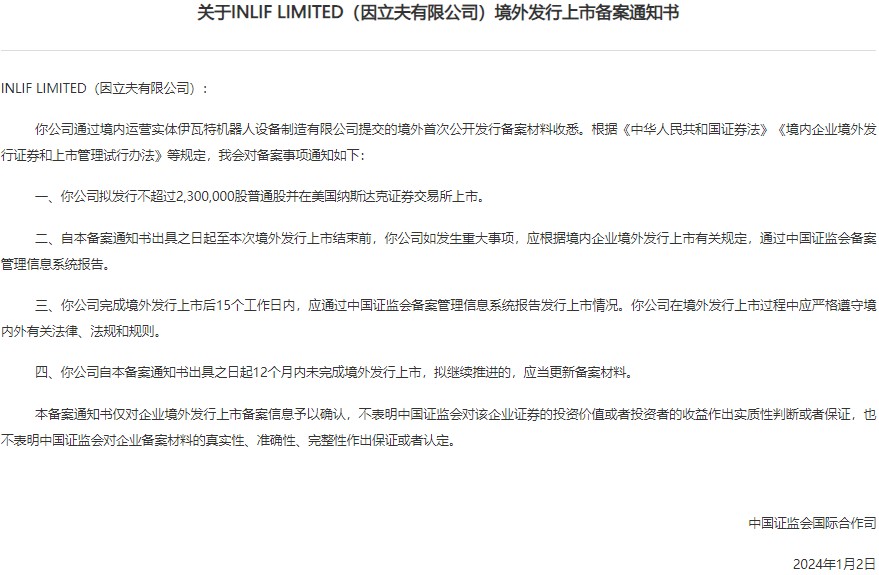 智通財經 APP 獲悉,1 月 4 日,中國證監會發布關於 INLIF LIMITED(因立夫有限公司) 境外發行上市備案通知書。該公司通過境內運營實體伊瓦特機器人設備製造有限公司提交的境外發行上市備案材料已獲中國證監會接收,公司擬發行不超過 230 萬股普通股並在美國納斯達克證券交易所上市。