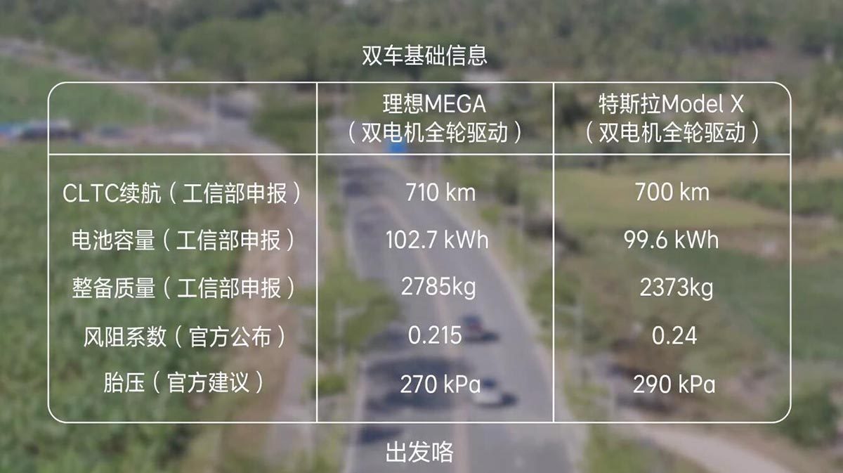 用于测试的 Li Mega 和 Model X 都是双电机全轮驱动车型,前者的电池组容量为 102.7 千瓦时,后者为 99.6 千瓦时。