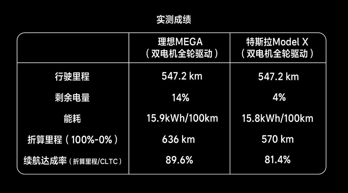 计划的测试距离为 616 公里,Li Mega 和 Model X 实际行驶了 547.2 公里。