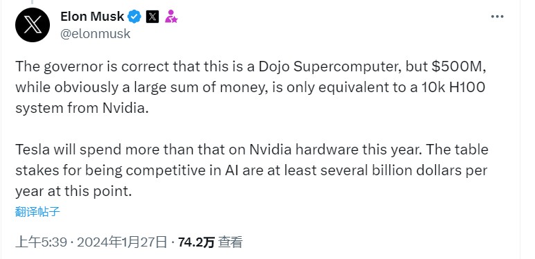 In a post on the social media platform X (formerly known as Twitter), Musk said, "Half a billion dollars, that's obviously a lot of money, but it's only equivalent to 10,000 NVIDIA-based AI systems."
