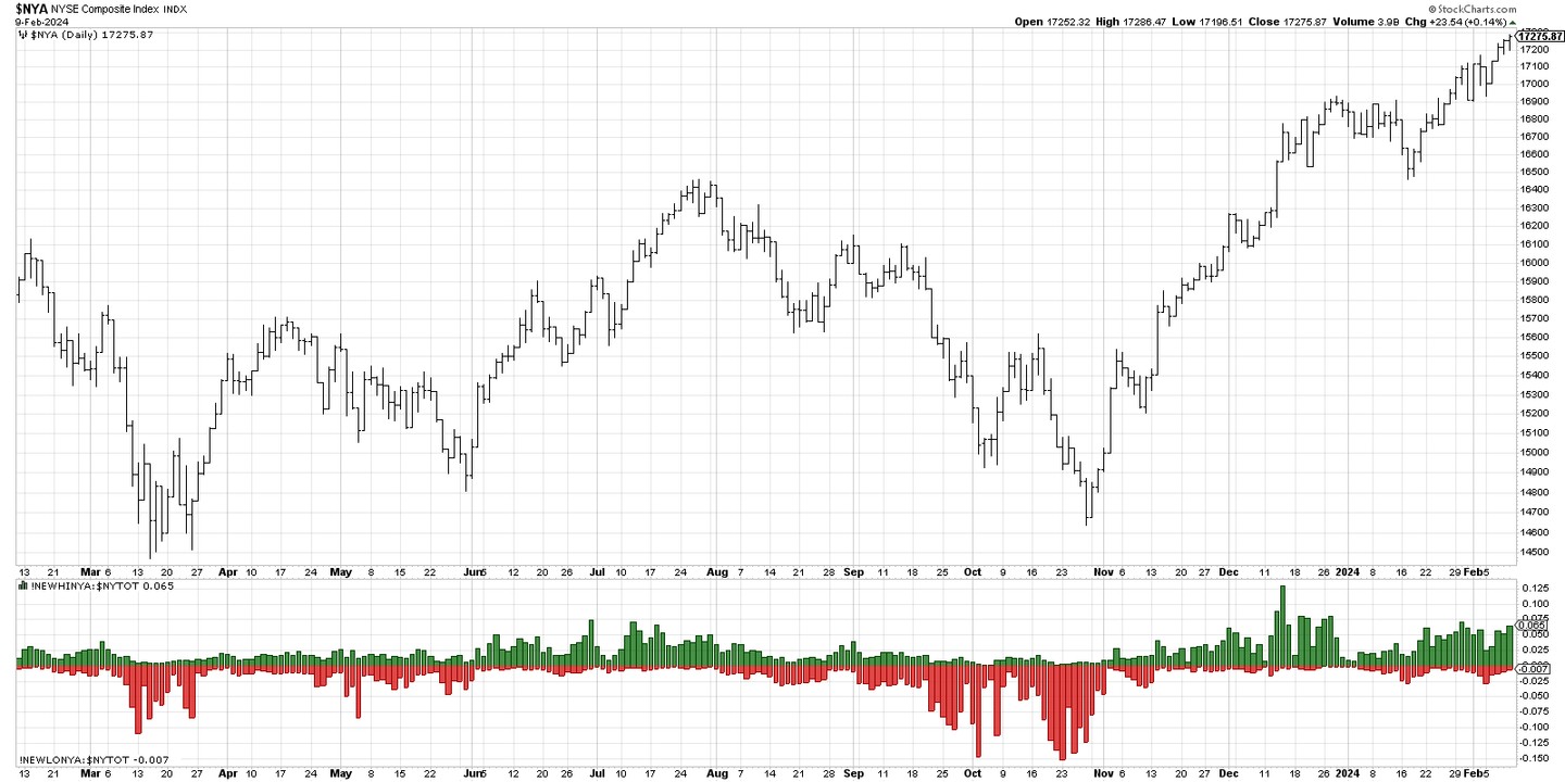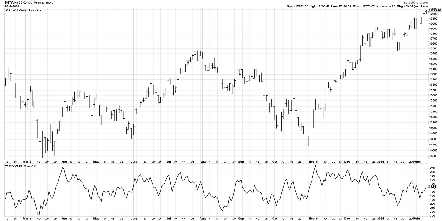 First, we need to confirm that the market is in an established uptrend, as this is an indicator designed to identify market tops. To make this assessment, we take a chart of the NYSE Composite index and look to make sure that the 50-day rate of change (ROC) is positive. So basically, the market is higher than it was ten weeks ago. If so, then the first condition is met.