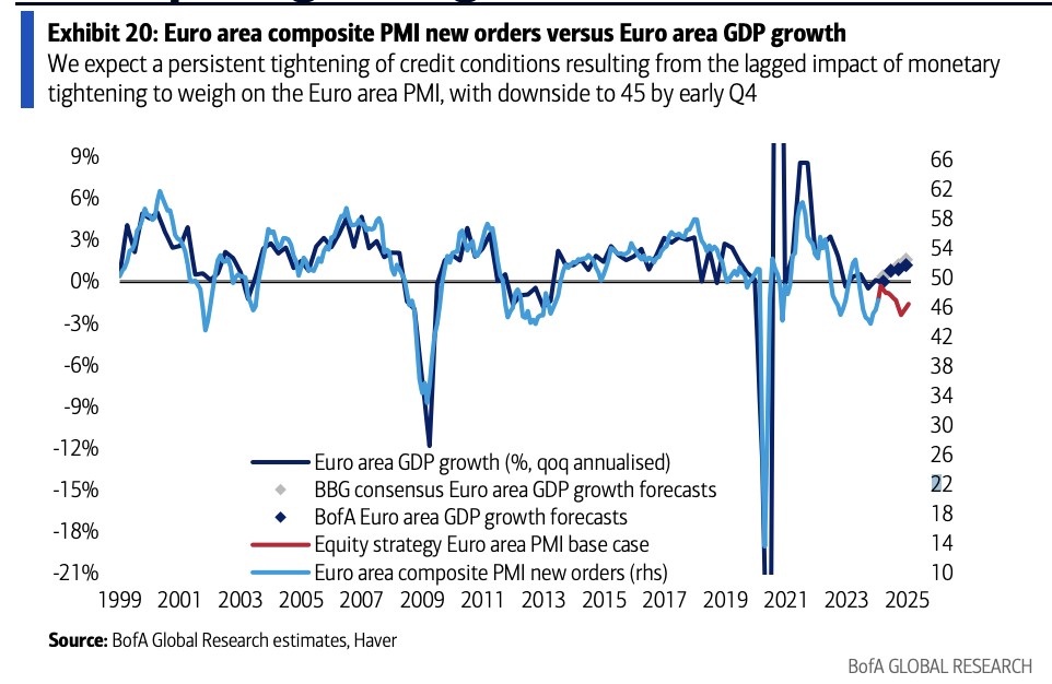 由於貨幣緊縮政策的滯後影響,信貸條件將持續收緊,訂單積壓帶來的支持將減弱,進一步影響經濟,這將對歐元區綜合 PMI 構成壓力,預計到第四季度將下降至 45。