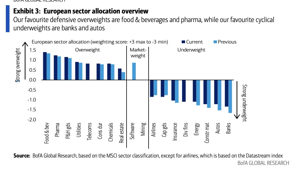 美銀認為,儘管當前的經濟數據足以讓歐洲股市保持較低風險溢價,但隨着增長動能減弱,這種情況可能不會持續,未來的不確定性和經濟放緩可能會對股市產生負面影響,導致風險溢價上升和每股收益下降,未來股市將再次走弱,預計週期性股票的表現不如防禦性股票: