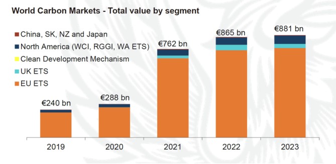 Overview of the total trading volume in the global major carbon markets from 2019 to 2023