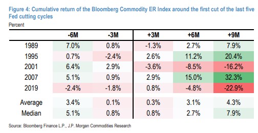 歷史上,商品價格在美聯儲首次縮表前都會產生正回報,降息後漲勢還將延續數月。如果摩根大通對美聯儲將於 6 月開始降息的預期成真,那麼商品市場正處於 “大幅反彈” 的階段。