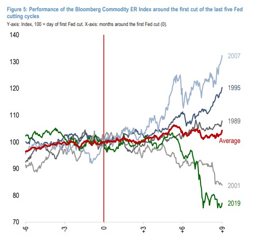 首次降息後,大宗商品在接下來的 9 個月內平均上漲了 4%。