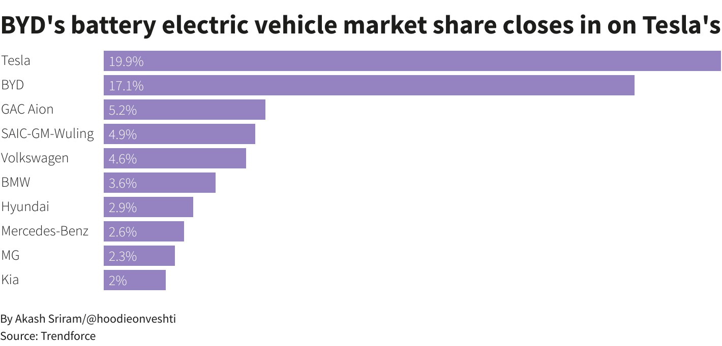 LIVE MARKETS-China's BYD set to snatch EV sales crown from Tesla