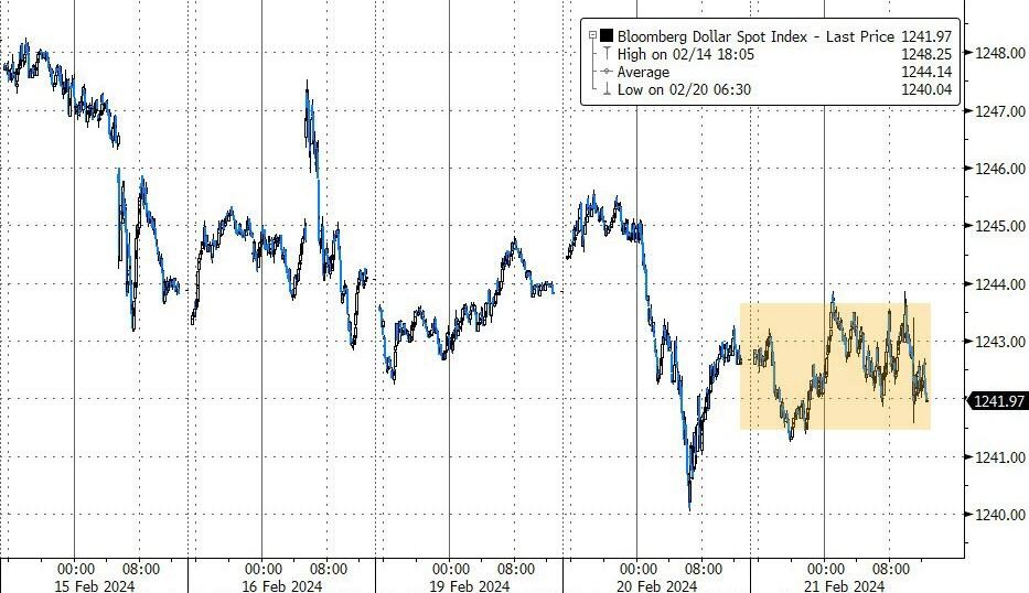 到週三美股收盤時,美元指數略低於 104.00,日內跌不足 0.1%,繼續刷新 2 月 7 日以來同時段低位;追蹤美元兑其他十種貨幣匯率的彭博美元現貨指數微跌,連跌三日。