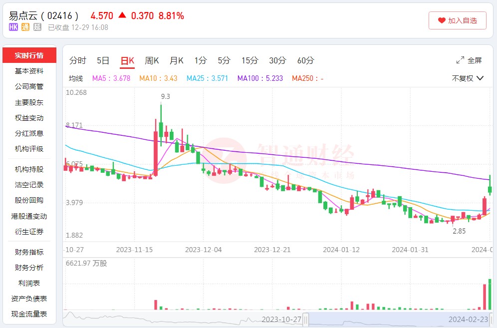 This positive development is clearly reflected in its stock price. On February 22, Yidian Cloud's stock price began a violent surge, rising by over 30% at one point during the day, ultimately closing up by 26.89% at HKD 4.2. On the 23rd, the stock price continued to rise, closing up by 8.81% at HKD 4.57, with a total market value of HKD 26.455 billion.