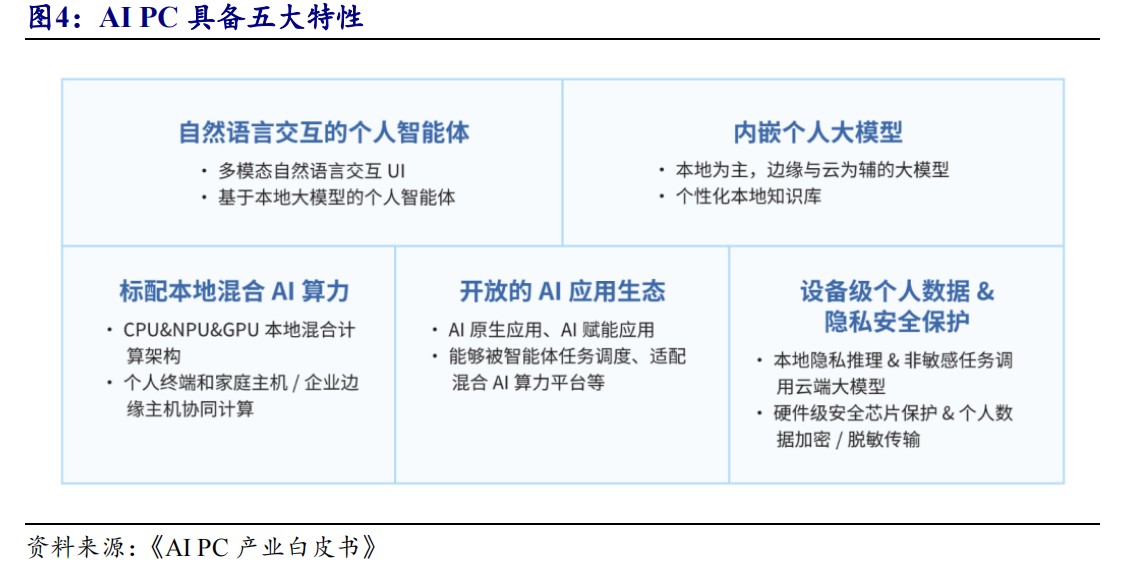 With PCs as the pivot, AIPC has five major features to support running large personal models. According to the "AIPC Industry White Paper," AIPC has five major features: embedding large personal models, possessing a personalized local knowledge base; having CPU, GPU, NPU local hybrid AI computing power; an open AI application ecosystem; natural language interaction capabilities; and device-level personal data and privacy protection.