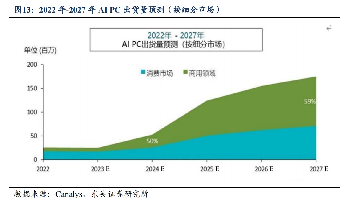According to Canalys' forecast, by 2023, support for Windows 10 in the market is nearing its end, providing an opportunity for users to migrate to AIPC. With the increasing advantages of AI functions, commercial applications will surge, and by 2025, the shipment volume of the entire category will exceed 100 million units. By 2027, AIPC shipments will surpass 170 million units, with nearly 60% deployed in the commercial sector.