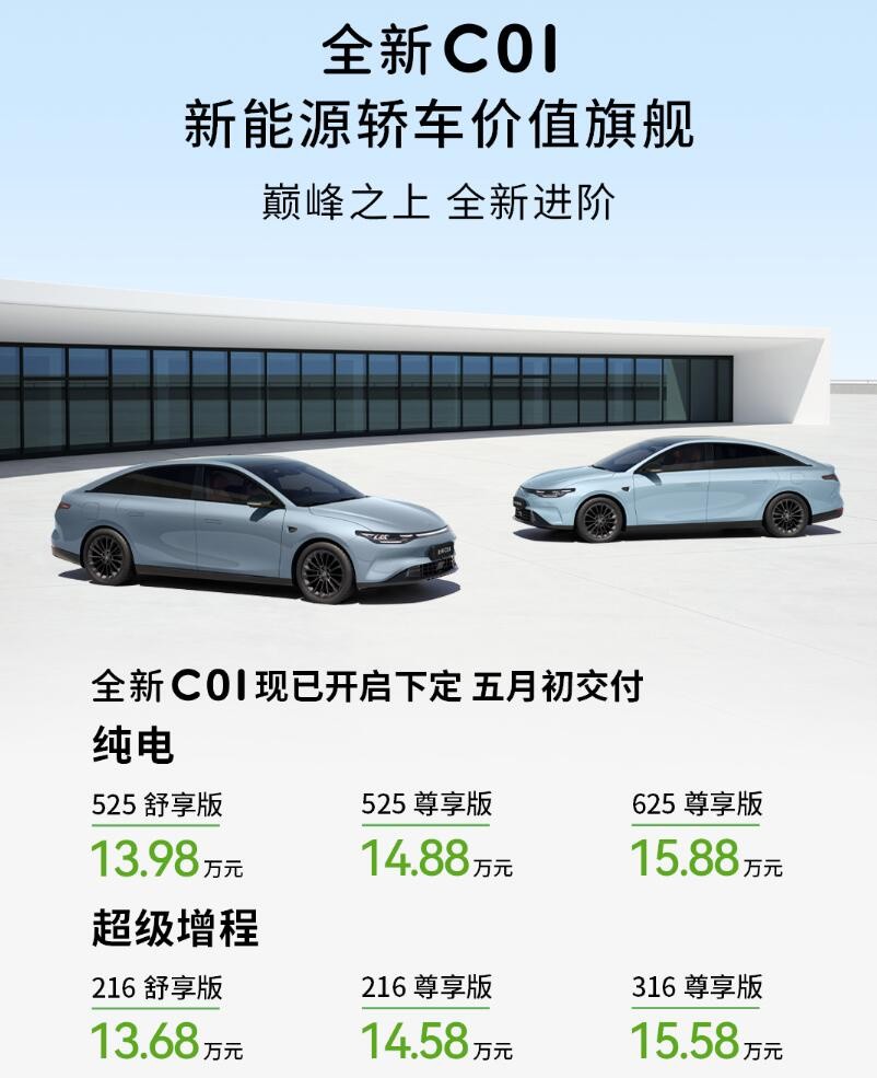 The updated C01 BEV is available in three versions with starting prices of RMB 139,800, RMB 148,800 and RMB 158,800, and CLTC ranges of 525 km, 525 km and 625 km, respectively.