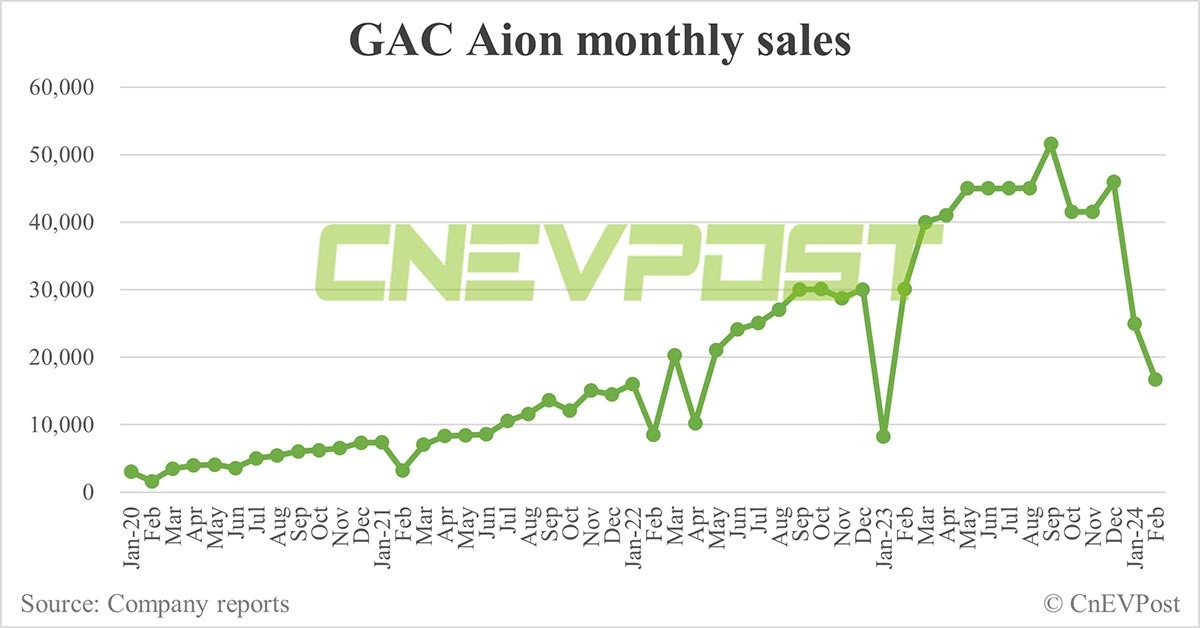 GAC Aion sold 16,676 units in February, down 44.57 percent year-on-year and down 33.15 percent from January, according to data it released on March 1.
