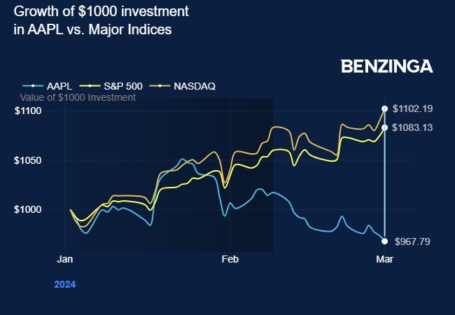 2024 年初投资 1000 美元在苹果股票上,今天价值 967.79 美元。