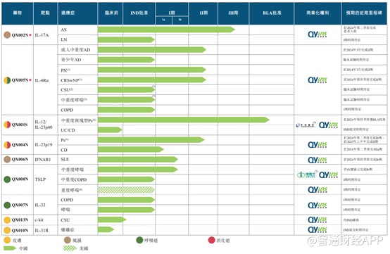 另一個核心產品 QX005N 旨在抑制 IL-4Rα,該靶點是一種經充分驗證可應用於廣泛適應症的靶點,公司已獲得七種適應症的 IND 批准,乃中國 IL-4Rα靶向候選藥物中適應症最多的藥物。目前 QX005N 針對 AD(特應性皮炎) 和 PN(結節性癢疹) 的 III 臨牀溝通申請已經遞交,用於治療 CRSwNP(慢性鼻竇炎伴鼻息肉) 的 II 期臨牀試驗亦已於 2023 年 4 月開始。