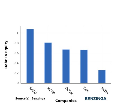 在其前 4 位同行中,NVIDIA 具有更強的財務狀況,負債與權益比率較低,為 0.26。