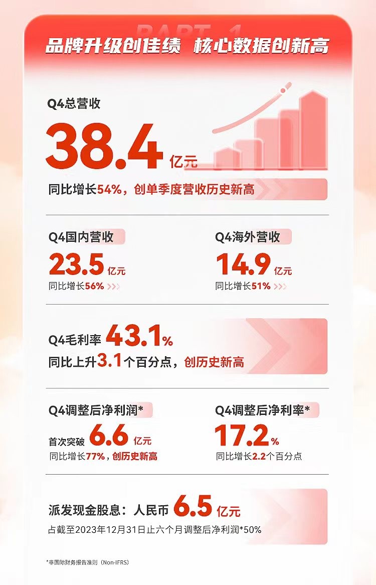 In the six months ending on December 31, 2023, the company's revenue was 7.632 billion yuan, an increase of approximately 45% year-on-year; the adjusted net profit was 1.303 billion yuan, an increase of approximately 65% year-on-year. At the same time, the board of directors announced a special cash dividend of $0.0725 per ordinary share, equivalent to about 650 million yuan, accounting for 50% of the adjusted net profit for the six months ending on December 31, 2023, as a tangible gesture to reward shareholders In addition to financial data, the outstanding performance of its operational data is also remarkable. During the period, the number of MNSO stores continued to grow. By the end of 2023, its total global store count reached 6413, including 3926 domestic stores and 2487 overseas stores, with a net increase of 372 overseas stores year-on-year, highlighting the scale effect.