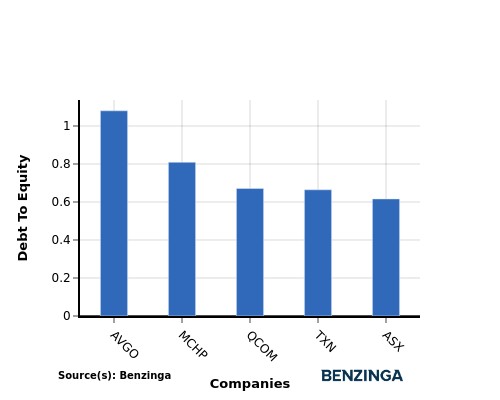 Broadcom exhibits a higher debt-to-equity ratio of 1.08 compared to its top 4 peers.