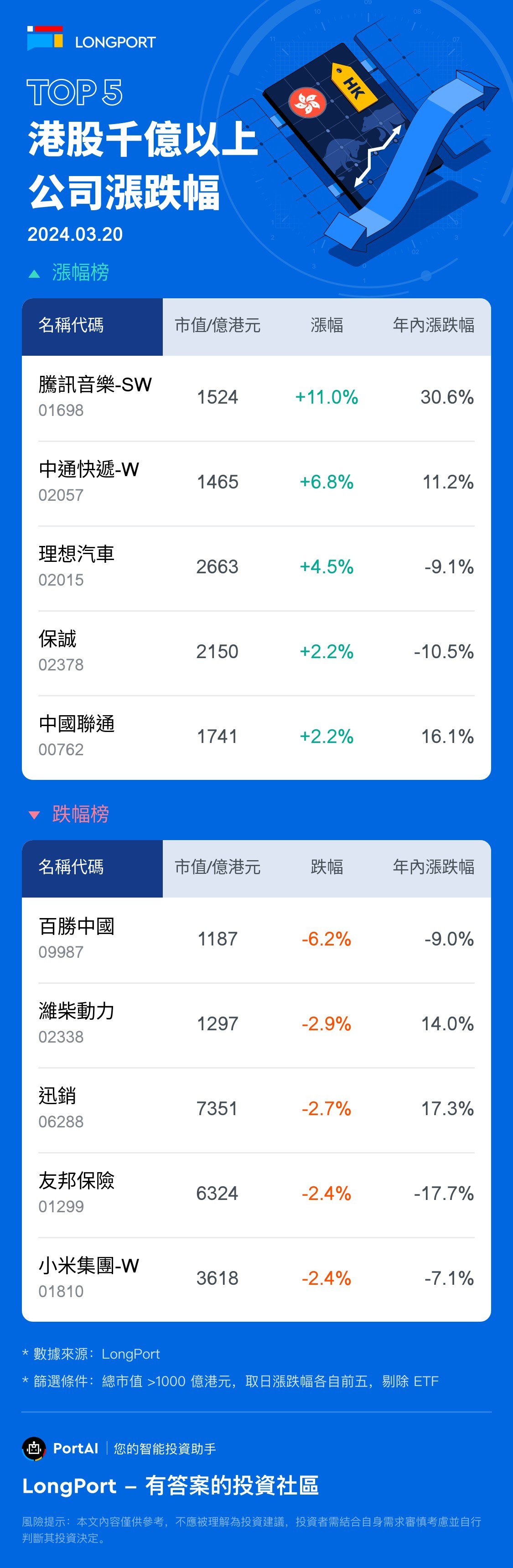Top 5 HK Stock Gainers/Losers (>100B) (3.20)