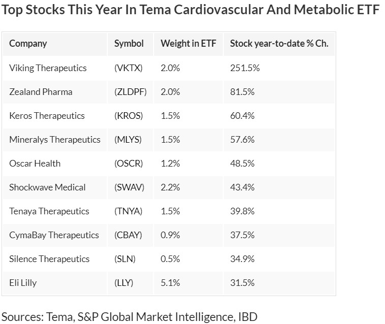 數據顯示,Viking Therapeutics 是該 ETF 今年表現最好的持倉股票。由於該公司的藥物未來有可能比諾和諾德以及禮來等競爭對手的減肥物更有效,該公司股價年內飆升 252%。也一直有人猜測該公司可能會被醫藥巨頭收購。這家總部位於聖地亞哥的公司估值僅為 69 億美元。另一方面,禮來股價在過去五年中飆升了近 130%,市值超過 7000 億美元。