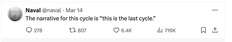 所有权向机构倾斜可能会导致更大的事情发生:主权国家拥有比特币。更多的国家可能会效仿萨尔瓦多,开始一场积累加密货币的竞赛,进而开启一个全球主流采用的超级周期。