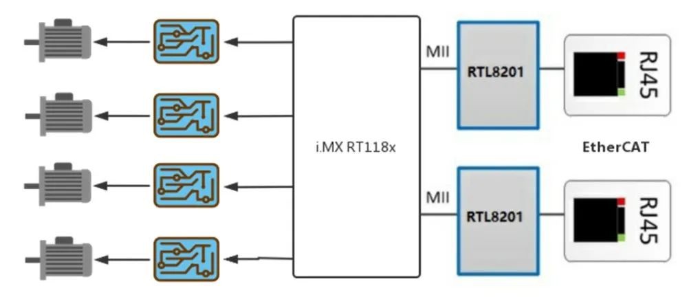 恩智浦i.MX RT1180跨界微控制器採用高性能雙核架構,具有先進的安全特性,支持多種網絡協議,i.MX1180集成800MHz的ARM cortex M7主核以及240MHz的Cortex M33 安全內核。i.MX RT 1180還提供五個千兆以太網口,支持Profinet,EtherCAT等工業以太網協議。同時該芯片包含4組PWM模塊(每個模塊4對PWM信號輸出),能夠最多支持4路電機的控制。該芯片有兩個16位的ADC,3個SINC用於外接 sigma-delta信號,12路最高速率20Mbps的uart接口(可以用於外接各種常用編碼器信號),因此,該芯片能夠通過單芯片實現EtherCAT控制4路電機的方案。
