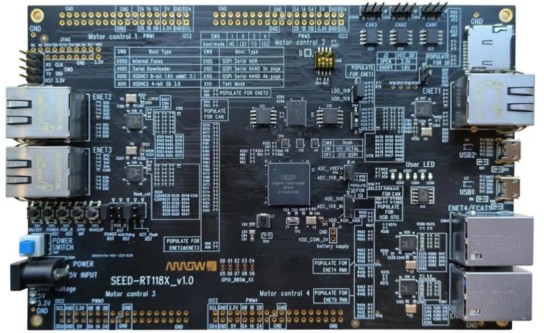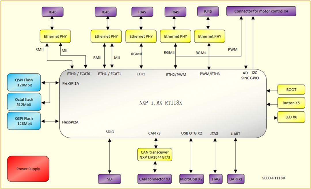 艾睿電子推出了基於i.MX RT1180的開發套件SEED-RT118X。該套件集成了多個外設存儲設備以及各種通信接口,搭配艾睿電子的電機驅動板,可以實現4個電機同時通過EtherCAT來控制,方便於用户對i.MX RT1180進行評估。