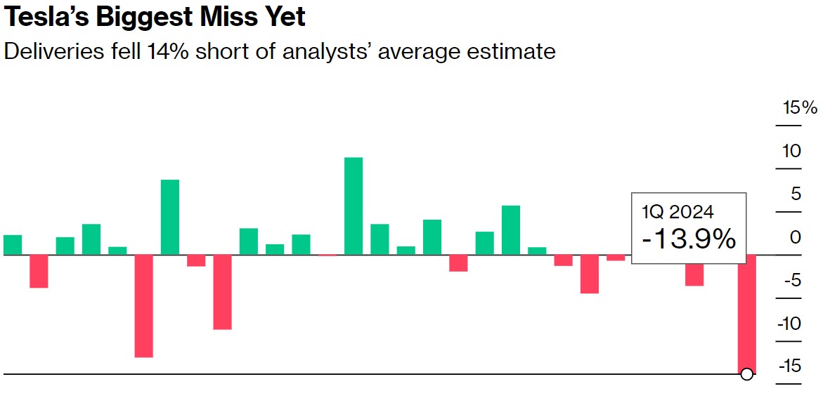 智通财经 APP 获悉,特斯拉在今年头三个月仅交付了 386810 辆汽车,与 7 年来的平均预测差距最大。周二特斯拉股价下跌利 4.9%,将其 2024 年的跌幅扩大至 33%,跌幅在标普 500 指数成分股中排名第二。