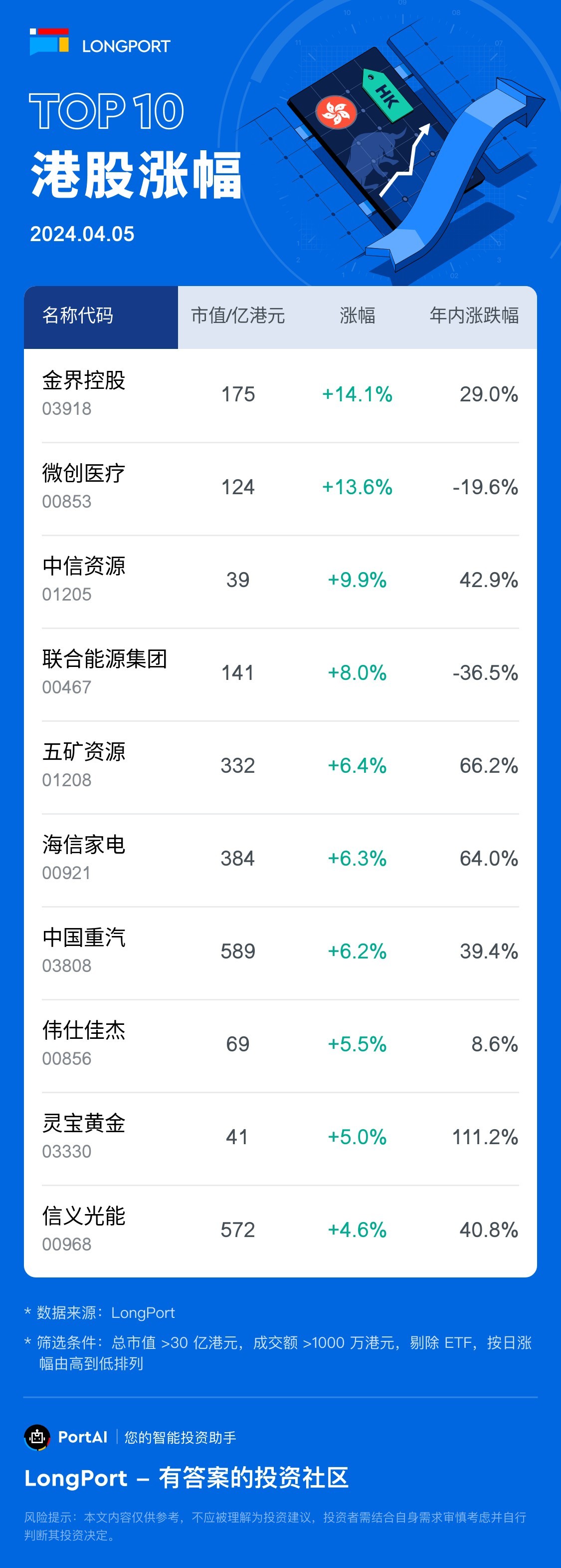 金界控股 (03918) 涨 14.12%,成交额 3167.5 万港元,年内累计涨 29%。