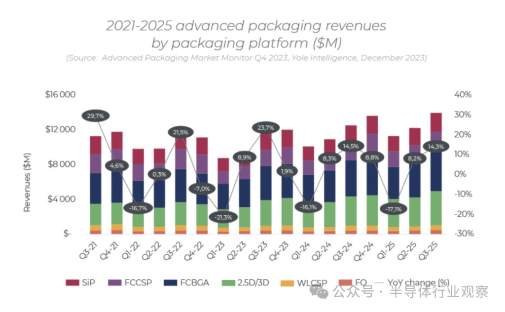 行業諮詢機構 Yole 在去年年底發佈的報告中表示,預計先進封裝市場在 2023 年將下降 1.4%,但 2023 年 Q3,先進封裝(AP)營收較上季度大幅增長 23.7%,總計達到 110 億美元。