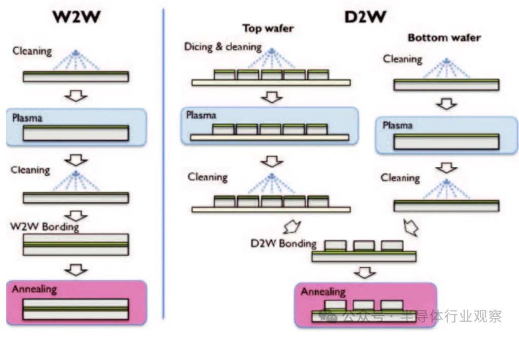 所謂混合鍵合,是指在一個鍵合步驟中同時鍵合電介質(dielectric)和金屬鍵合焊盤(metal bond pads)。具體而言,混合鍵合有兩種類型:一種是晶圓到晶圓(wafer-to-wafer:W2W)鍵合,這種方式更加成熟,但限制了相同芯片尺寸的組合;另一種是芯片到晶圓(die-to-wafer:D2W)鍵合,它涉及更多的工藝步驟以及將芯片單獨放置在載體晶圓或玻璃上(集體芯片到晶圓方法)。