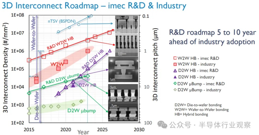 “但是,為了進一步擴展,我們需要另一種範式轉變:採用混合鍵合的無凸塊互連的混合鍵合,其尺寸超出了 10 微米互連間距,路線圖為 100 納米範圍,並且它不使用任何中介物,例如具有更高電阻的焊料。”