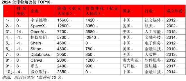 胡潤研究院發佈了 2024 全球獨角獸榜,字節跳動、SpaceX 和 OpenAI 位列前三。OpenAI 因為生成式 AI 的爆發成為過去一年全球表現最好、成長最快的獨角獸,估值達到 7100 億元。全球獨角獸企業數量增長至 1453 家,前十名價值佔總價值的 18%。中國獨角獸企業螞蟻集團、Shein 和微眾銀行在排名中有所下降。此外,全球前十名獨角獸名單中還有 Databricks、Canva 和幣安等公司。