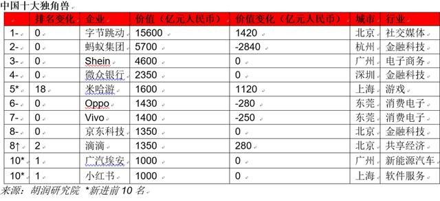 總部杭州的螞蟻集團下降一位至第四,價值下降 2800 多億至 5700 億元;創立於廣州的跨境電商 Shein 下跌一位至第五,價值為 4600 億元;雖然價值上升了近 800 億元,但總部位於舊金山的支付平台 Stripe 下跌一位至第六,價值為 4300 億元;背靠騰訊的數字銀行微眾銀行以 2350 億元的價值維持在前十名,下降了 4 位,目前微眾銀行管理資產餘額超過 2 萬億元人民幣。