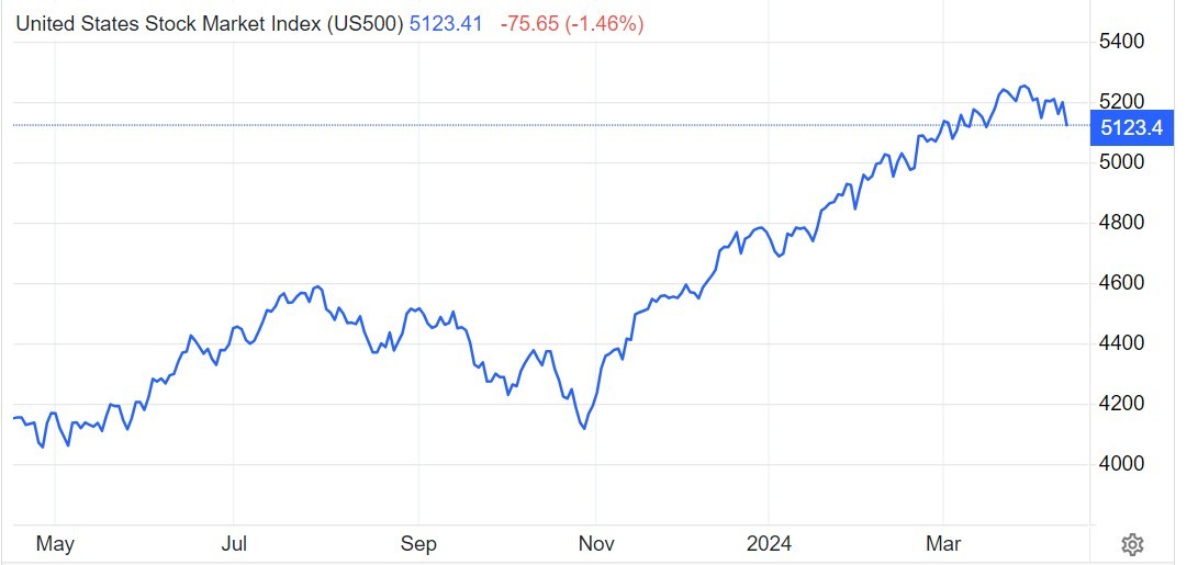 基準指數標普 500 指數上週五收盤於 5123.41 點,周跌幅 1.56%,但是今年以來上漲近 8%。
