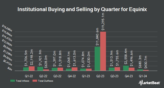 Several other large investors have also made changes to their positions in EQIX. Vanguard Group Inc. boosted its stake in shares of Equinix by 0.3% in the 3rd quarter. Vanguard Group Inc. now owns 12,231,182 shares of the financial services provider's stock valued at $8,883,018,000 after purchasing an additional 34,926 shares during the last quarter. Geode Capital Management LLC grew its holdings in Equinix by 1.2% during the 1st quarter. Geode Capital Management LLC now owns 2,004,008 shares of the financial services provider's stock worth $1,441,837,000 after acquiring an additional 23,150 shares during the period. Principal Financial Group Inc. raised its position in shares of Equinix by 44.6% during the 3rd quarter. Principal Financial Group Inc. now owns 1,398,418 shares of the financial services provider's stock valued at $1,015,610,000 after acquiring an additional 431,435 shares during the last quarter. Northern Trust Corp lifted its stake in shares of Equinix by 1.7% in the 3rd quarter. Northern Trust Corp now owns 1,187,990 shares of the financial services provider's stock valued at $862,790,000 after purchasing an additional 20,241 shares during the period. Finally, Norges Bank acquired a new position in shares of Equinix in the 4th quarter valued at $725,557,000. Institutional investors and hedge funds own 94.94% of the company's stock.