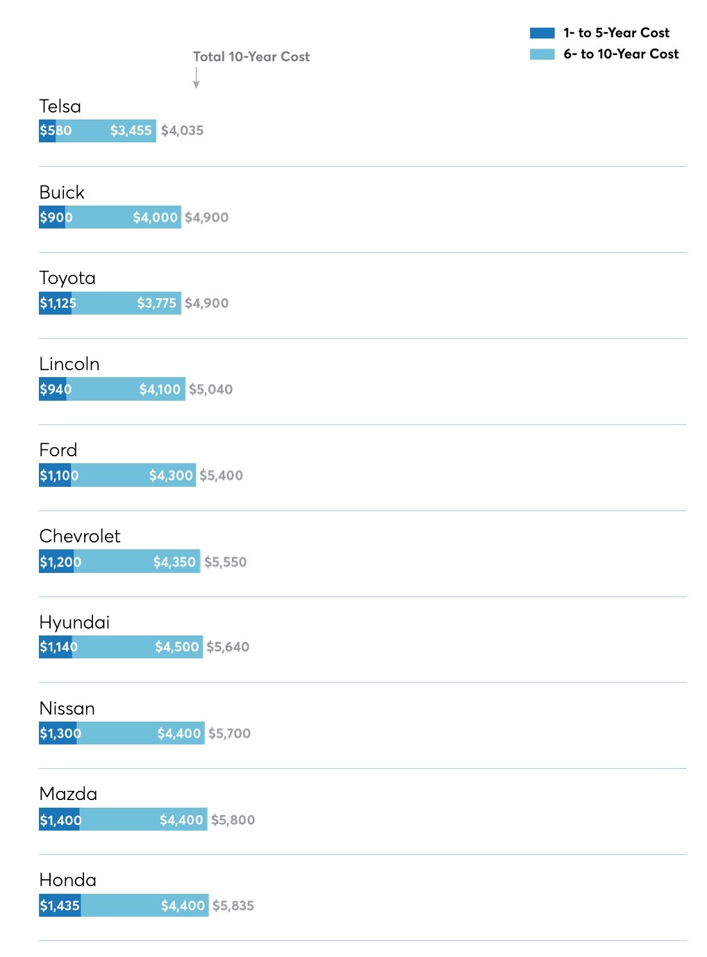 Tesla was followed by Buick ($4,900), Toyota ($4,900), and Lincoln ($5,040), with the analysis generally looking at repair and maintenance costs over one- to five-year and six- to 10-year periods. Notably, the report says that some niche luxury gas vehicle brands tended toward the top of the cost spectrum, while electric vehicle (EV) maker Tesla had lower costs across the board—a fact long touted by the U.S. automaker.