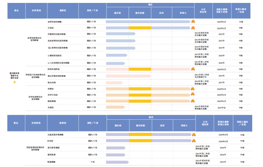 In terms of the product pipeline, as of March 20, 2024, Brain Dynamic Aurora's core product - the Brain Function Information Management Platform software system (referred to as the "system") has achieved commercialization for eight indications of four major types of cognitive disorders, and is currently developing an additional 21 indications for cognitive disorders. During the period, this system has been included in the provincial medical insurance reimbursement catalogs of 30 provinces in China.
