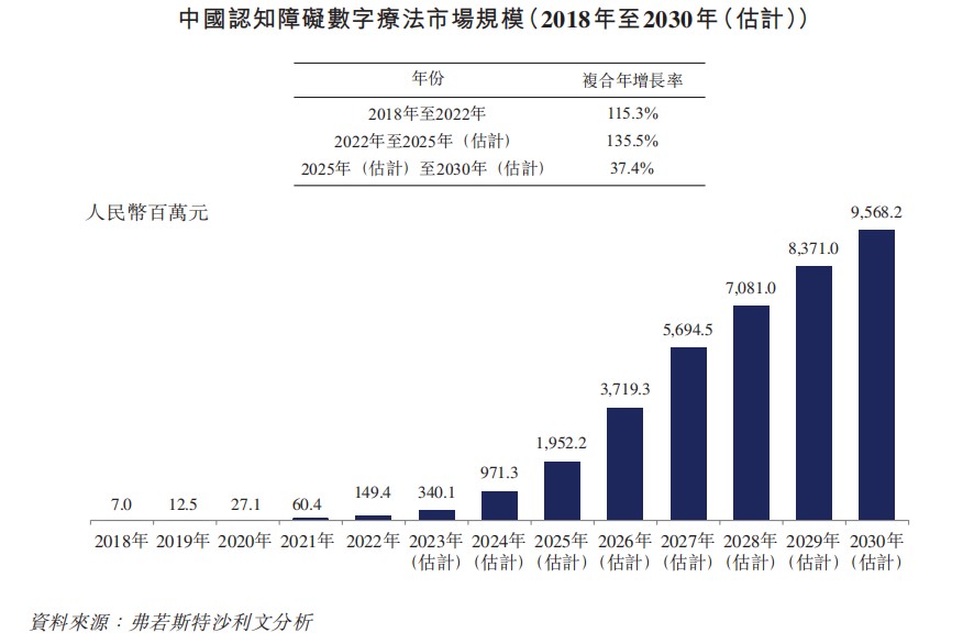 According to Frost & Sullivan data, in 2022, the global market size of digital therapies for cognitive disorders reached 2.1 billion U.S. dollars, and is expected to increase to 4.2 billion U.S. dollars by 2025 and 7.0 billion U.S. dollars by 2030, with compound annual growth rates of 25.5% and 10.7% respectively Among them, China has greater growth potential: in 2022, the market size of cognitive impairment digital therapy in China reached RMB 149.4 million, and is expected to increase to RMB 1,952.2 million by 2025 and RMB 9,568.2 million by 2030, with compound annual growth rates of 135.5% and 37.4% respectively.