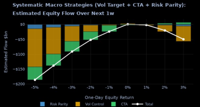 根據摩根士丹利量化分析,如果美股繼續下跌,當前系統化基金由於多頭頭寸極度龐大,預計會被迫大量賣出股票頭寸,導致股市進一步下跌。