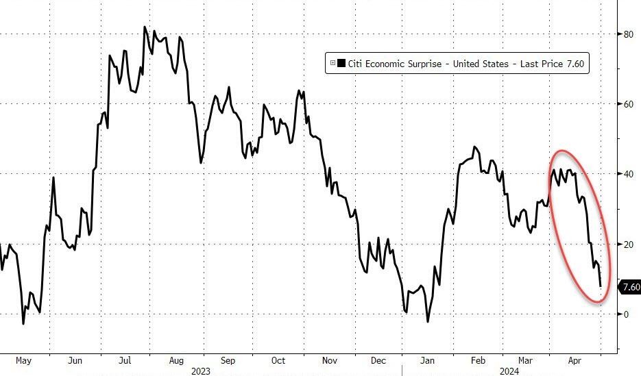 而回顧整個 4 月,美國宏觀經濟簡直就是一場災難:美國花旗經濟意外指數從 4 月初的 40 上方暴跌至 7.6。